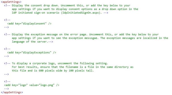 appSettings comes directly under the configuration section. Uncomment the ‘add key=”logo”‘ line and change the value to the URL of your desired header logo.