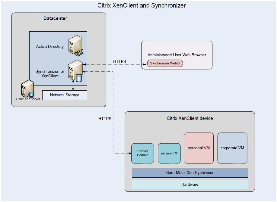 XenClient can work with the Synchronizer service to get the latest VM images. Synchronizer is the hub for publishing VMs and assigning them to users and their devices. XenClient connects to Synchronizer to download new or updated VMs based on what the Synchronizer administrator has specified.