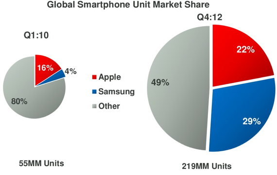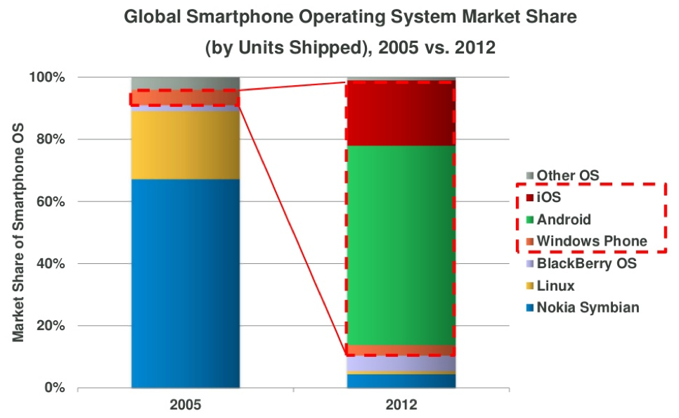 This graph highlights how much the market has moved in the seven years between 2005 and 2012. What the chart does not reveal is the quantity of devices being sold.